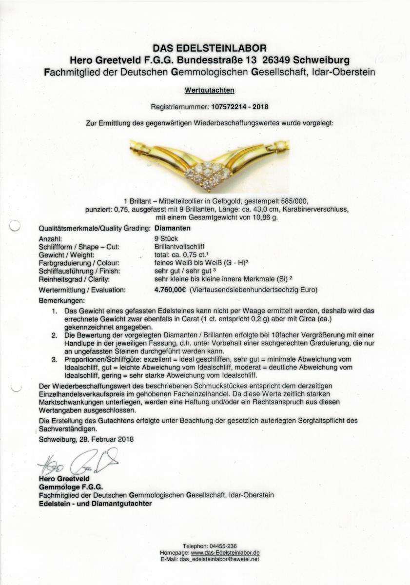 Gelbgold 585 gestempelt. Brillanten zus. ca. 0,75 ct/G-H/si). L 42,5 cm. 10,86 g.