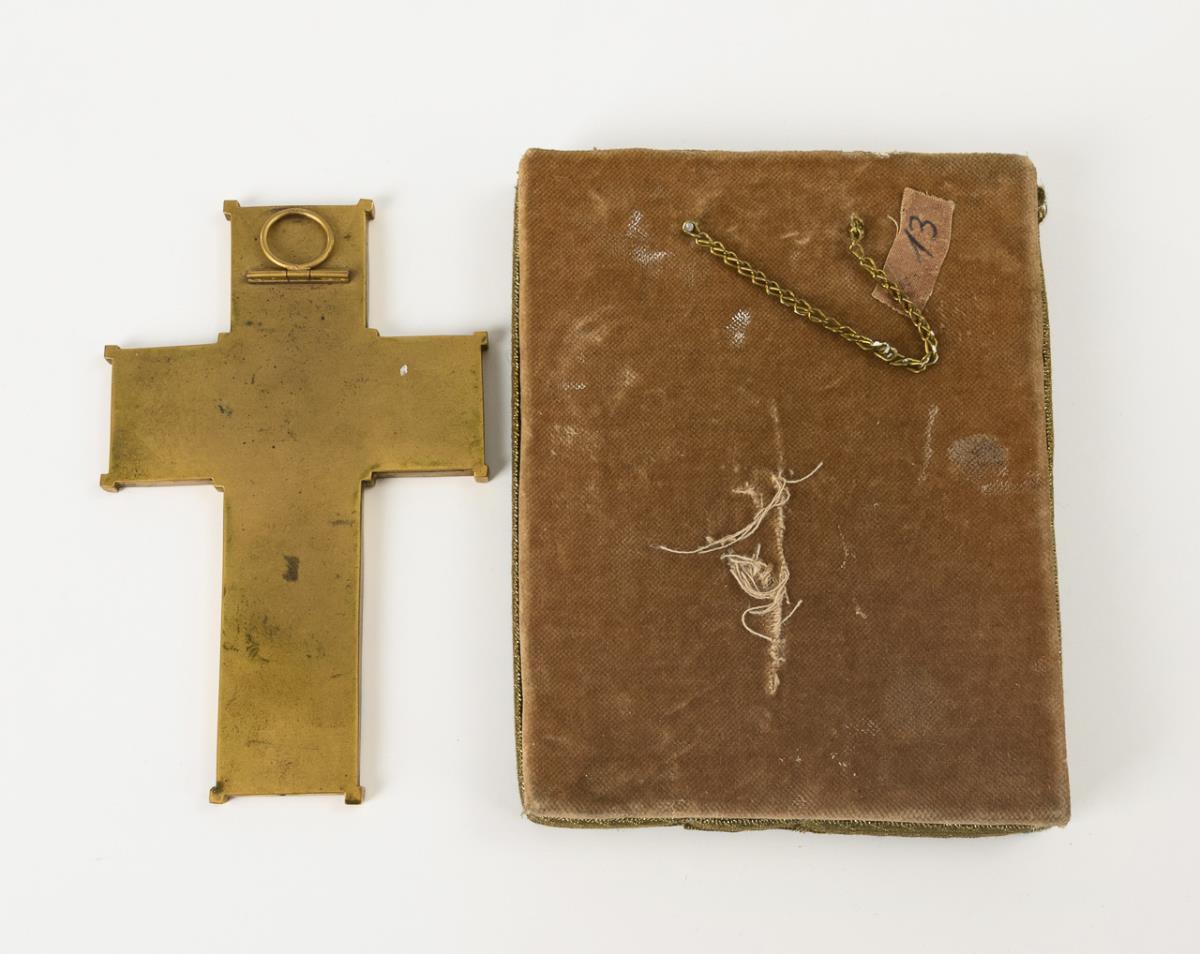 In 6 Bildfeldern aufgeteiltes lateinisches Kreuz mit zentraler Kreuzigungsszene; rückseitig Hängeöse. / Im fein guillochierten und gravierten Oklad die Gottesmutter mit dem Jesuskind. Defekte am Oklad.