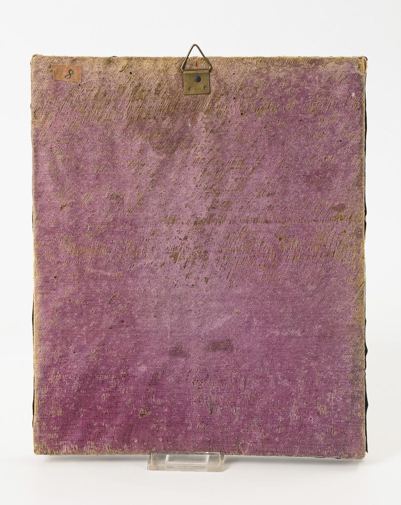 Tempera/Holz, Metall mit silberfarbenem Überzug und Messing, rückseitig violetter Stoff.