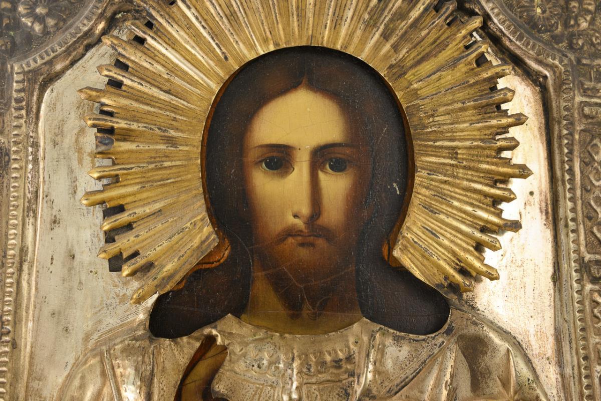 Kyrillisch bezeichneter Jesus Christus als Weltenherrscher im orthodoxen Segensgestus mit kyrillisch beschriftetem Buch und Hand. Ornamental reliefiertes Oklad. Krakeliert, Oklad verbogen und berieben.