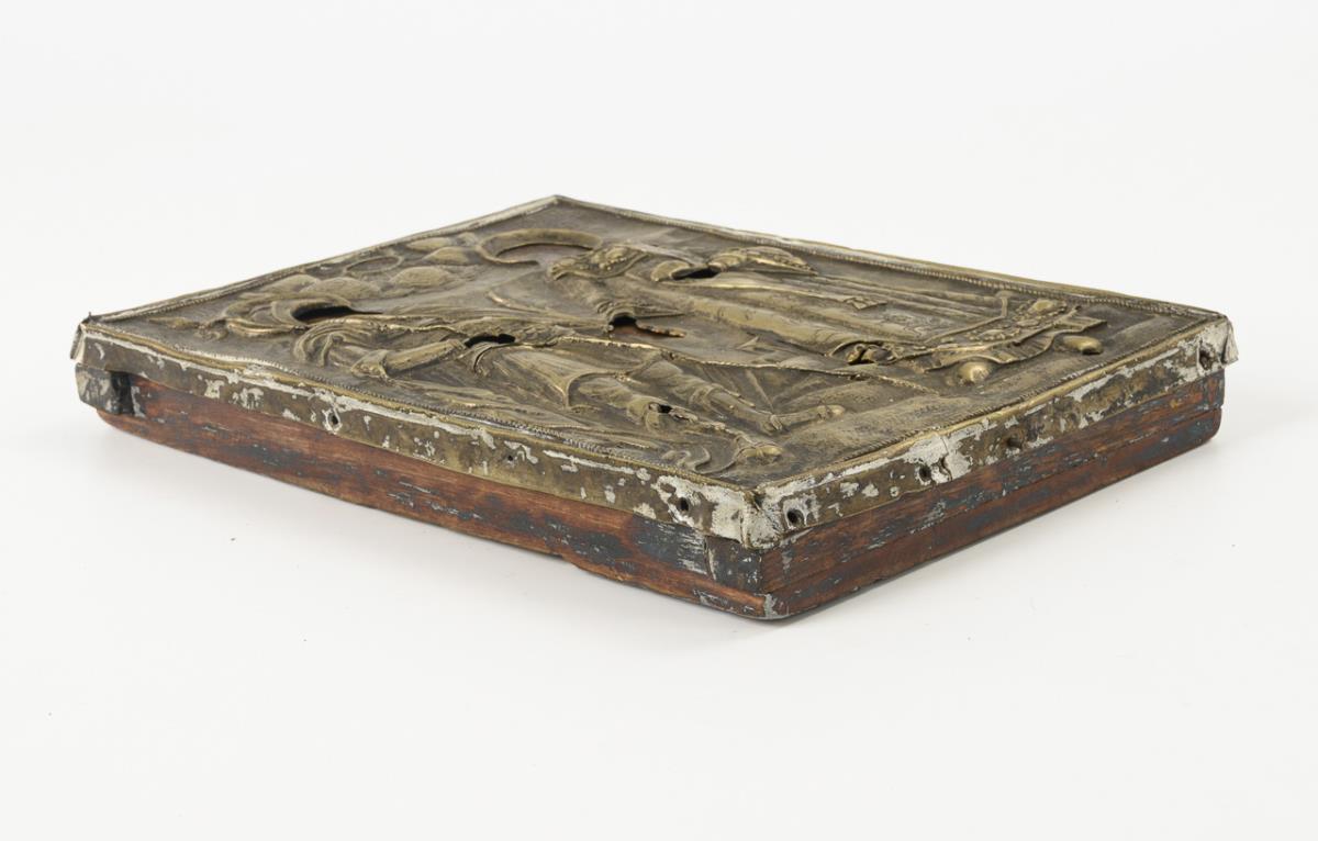 Kyrillisch beschriftete, stehende Heilige in Rüstung bzw. Ornat. Krakeliert und verschmutzt, Oklad teils durchgeputzt, verbogen und mit Rissen am Rand.
