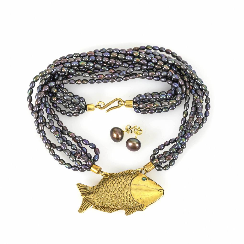 Plastisch gestalteter Fisch an Schnürketten mit kleinen Zuchtperlen,an Hakenverschluss. Dazu passendes Ohrsteckerpaar mit Zuchtperlen, an Steckmechanik.
