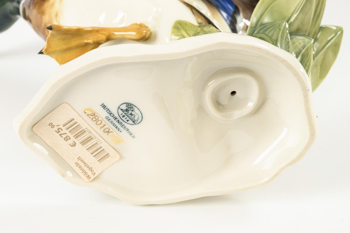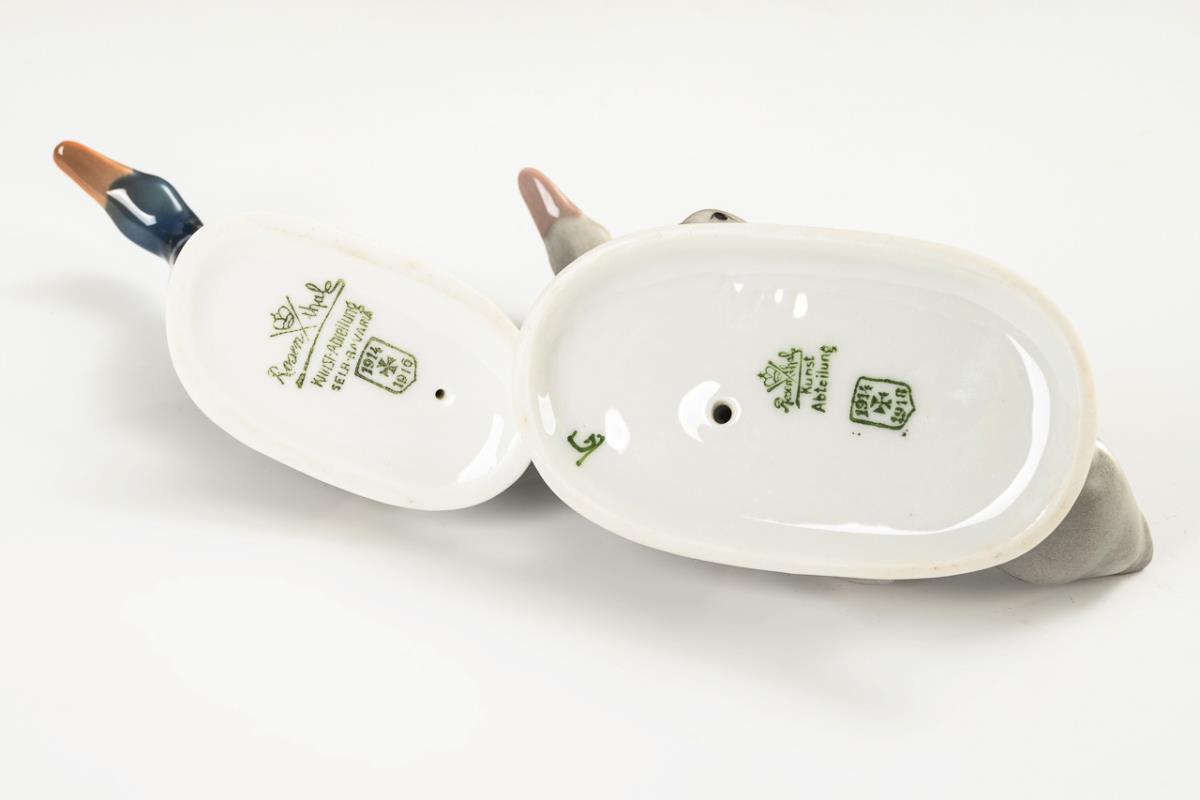 2x ROSENTHAL, 1916 und 1918, Entwurf von Karl Himmelstoß (1872-1967): Entenpaar (H 7,5 cm) und Erpel (H 6,5 cm). / 1x HUTSCHENREUTHER, ab 1970, Entwurf Uwe Netzsch (*1944): über einer Seerose auffliegender Erpel (H 30 cm).