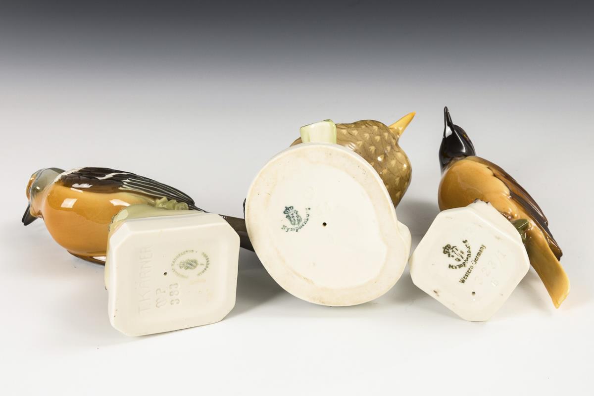 1x Modell-Nr. 458, Entwurf 1909 von Christian Wittmann (1871-1958): Amselküken (H 11,5 cm). / 1x Modell-Nr. 383, Entwurf 1913 von Theodor Kärner (1884-1966): Buchfink (H 14 cm). / 1x Modell-Nr. 323, Entwurf 1911 von Theodor Kärner: Gartenrotschwanz (H 11,5 cm).