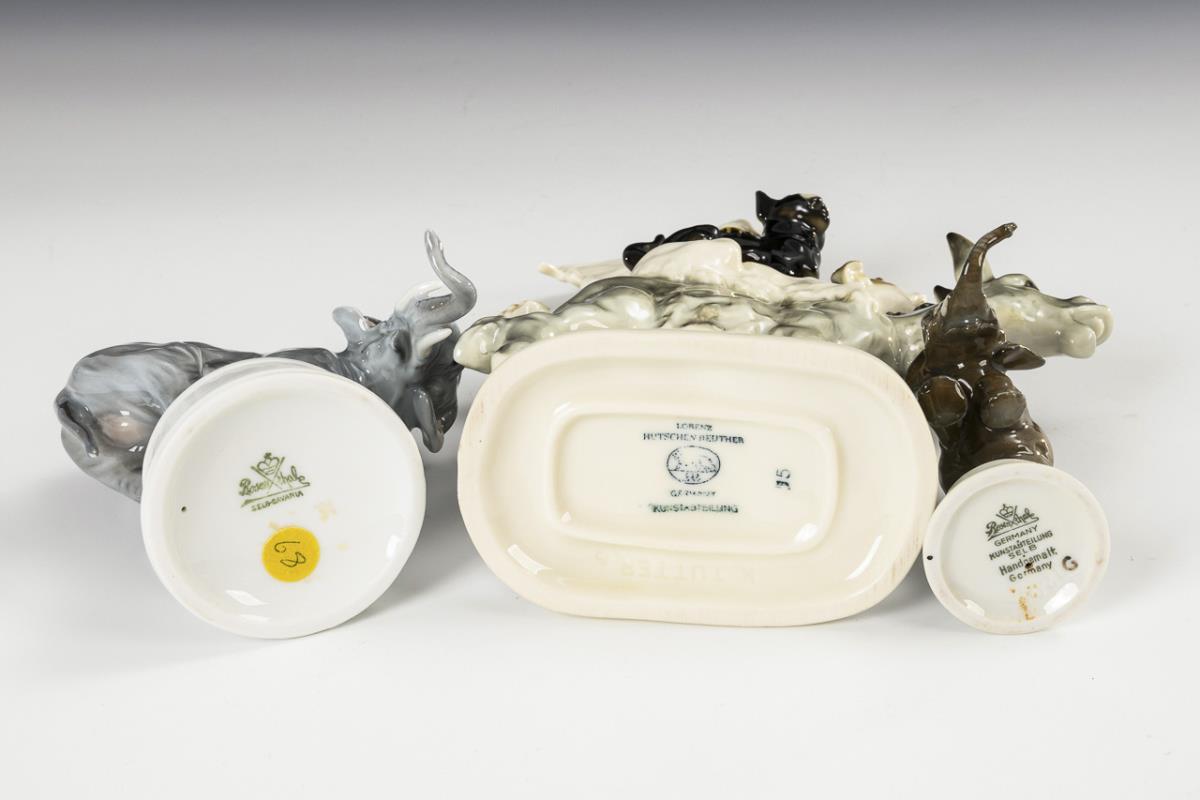 1x HUTSCHENREUTHER, Entwurf von Karl Tutter (1883-1969): Die Bremer Stadtmusikanten (H 19 cm). / 2x ROSENTHAL: 2 Elefanten auf Podest, Modell-Nr. 726 (Entwurf 1924 von Karl Himmelstoß) und K 335 (Entwurf 1913 von Fritz Diller) (H 6,5 und 9 cm). Hahnenkamm und 1 Elefantenschwanz bestoßen.