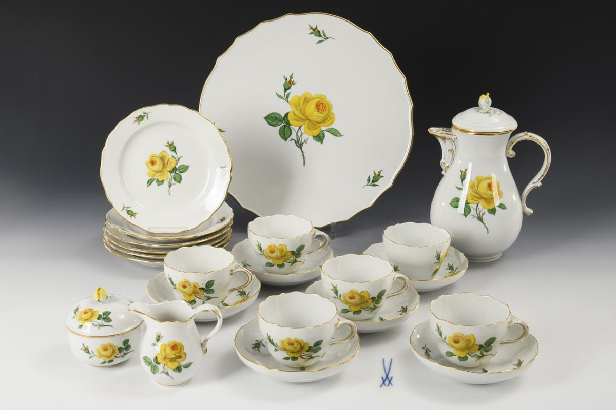 22 Teile. Form "Neuer Ausschnitt". Kaffeekanne (H 23 cm), Milchkännchen, Zuckerdose, 6 Kaffeetassen, 6 Untertassen, 6 Frühstücksteller und 1 Tortenplatte (Ø 32,5 cm).