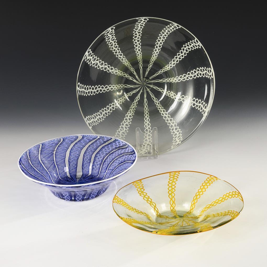 Farbloses Glas mit eingeschmolzenen opalweißen, opalgelben bzw. kobaltblauen Spiralfäden, 2x mit farbigem Emailrand. Ø 20,5, 25,5 und 20 cm.