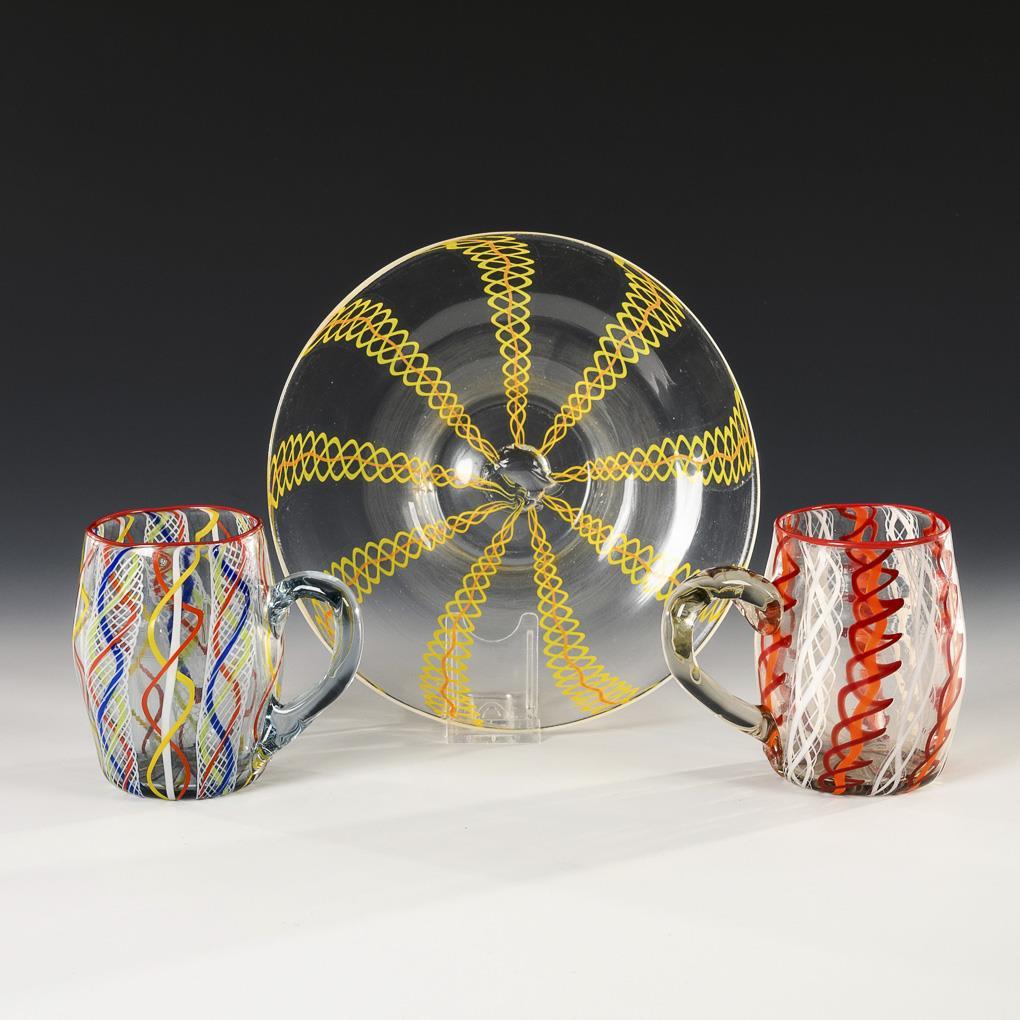 Farbloses Glas mit eingeschmolzenen Spiralfäden aus farbigem Opalglas und buntem Glas, 2x mit rotem Emailrand. 2 Bierkrüge (H 11 cm), 1 Teller (Ø 21,5 cm).