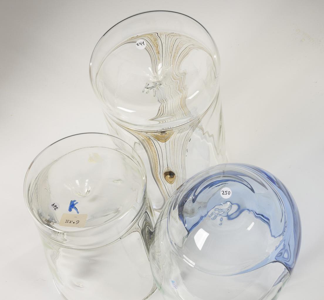 1x Zylindervase aus farblosem Glas (H 19,5 cm). / 1x leicht konische Vase aus farblosem Glas (H 15 cm). / 1x bauchig-ovale Vase aus farblosem, hellblauem und kobaltblauem Glas (H 16,5 cm).
