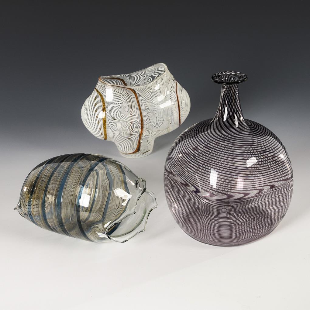 1x quadratische Flasche aus farblosem Glas mit spiralig eingeschmolzenen violetten Fäden (H 17,5 cm). / 1x Vase aus farblosem Glas mit spiralig eingeschmolzenen opalweißen Fäden und gelben Glasbändern (H 12 cm). / 1x Glasobjekt aus farblosem und petrolfarbenem Glas (L 15,5 cm).