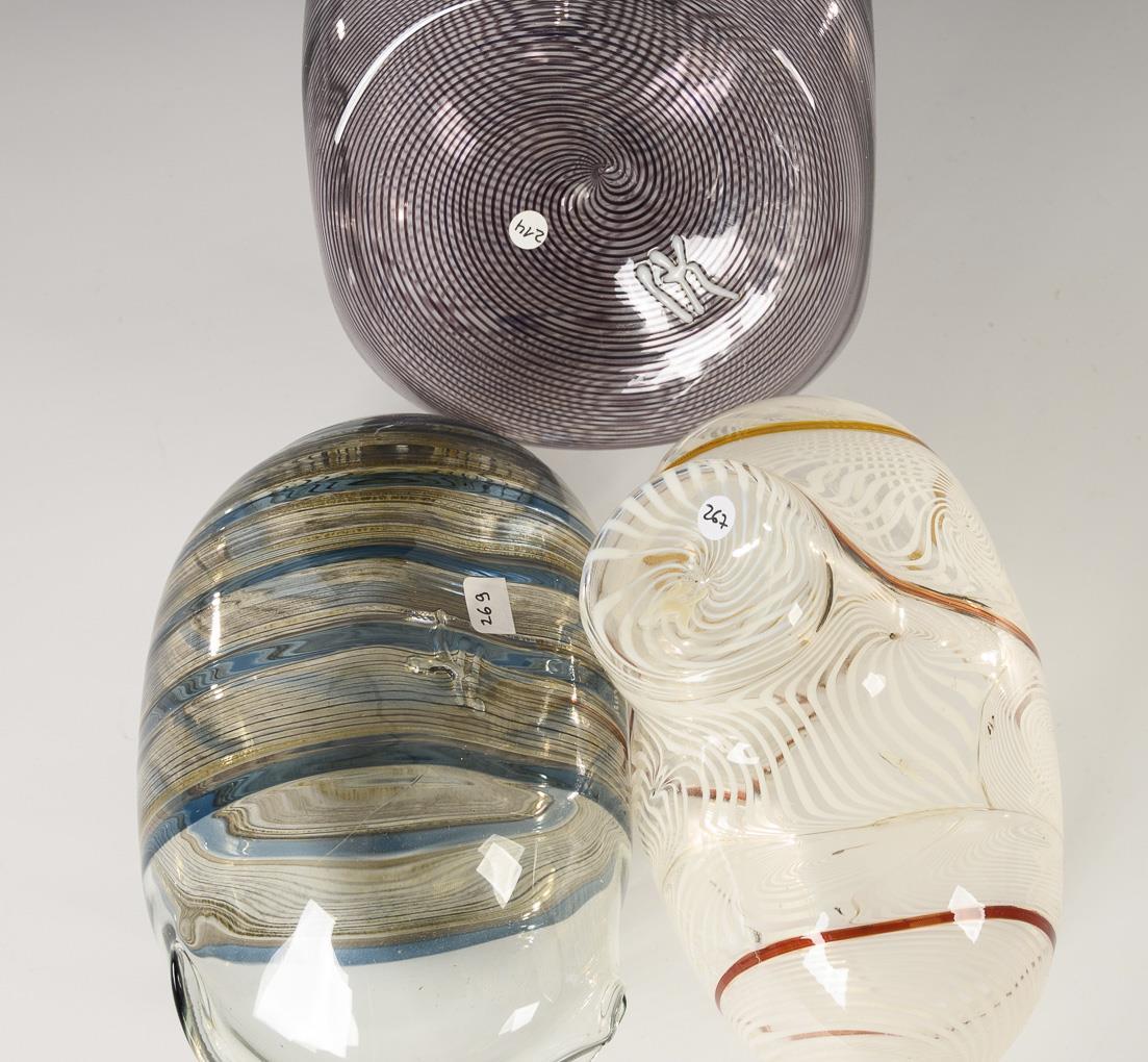 1x quadratische Flasche aus farblosem Glas mit spiralig eingeschmolzenen violetten Fäden (H 17,5 cm). / 1x Vase aus farblosem Glas mit spiralig eingeschmolzenen opalweißen Fäden und gelben Glasbändern (H 12 cm). / 1x Glasobjekt aus farblosem und petrolfarbenem Glas (L 15,5 cm).