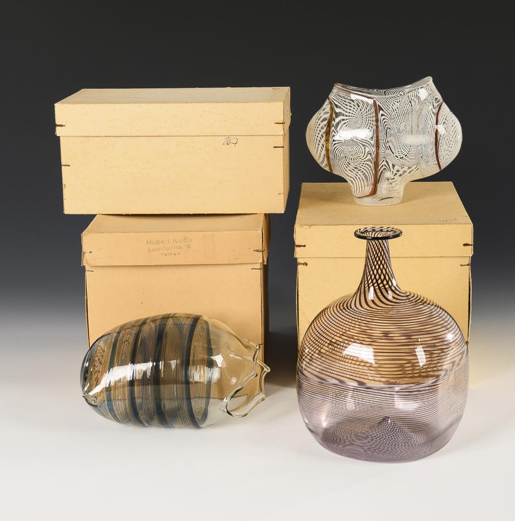 Deutscher Kunstglasbläser, Glasgestalter und Glaskünstler; Mitglied des Verbandes Bildender Künstler der DDR, freischaffend in Lauscha tätig. Seit 1977 Teilnahme an zahlreichen nationalen und internationalen Ausstellungen. Künstlerischer Leiter der Internationalen Glassymposien in Lauscha 1986 und 1989; „Aus dem breiten Umfeld von Lampenglasbläsern im Thüringer Wald, die Albin Schaedel (1904 – 1999) von der Gestaltung von Tierfiguren ins Gefäß folgten, konnte sich Hubert Koch als einziger von dessen Vorbild wirklich lösen und sich auch im internationalen Vergleich eine höchst eigenständige Formensprache erarbeiten. Seine zarten Gläser, in denen er oft undekorierte Flächen und Anklänge an Naturformen gegenüberstellt, wurden vielfach ausgezeichnet." Im Originalkarton..
