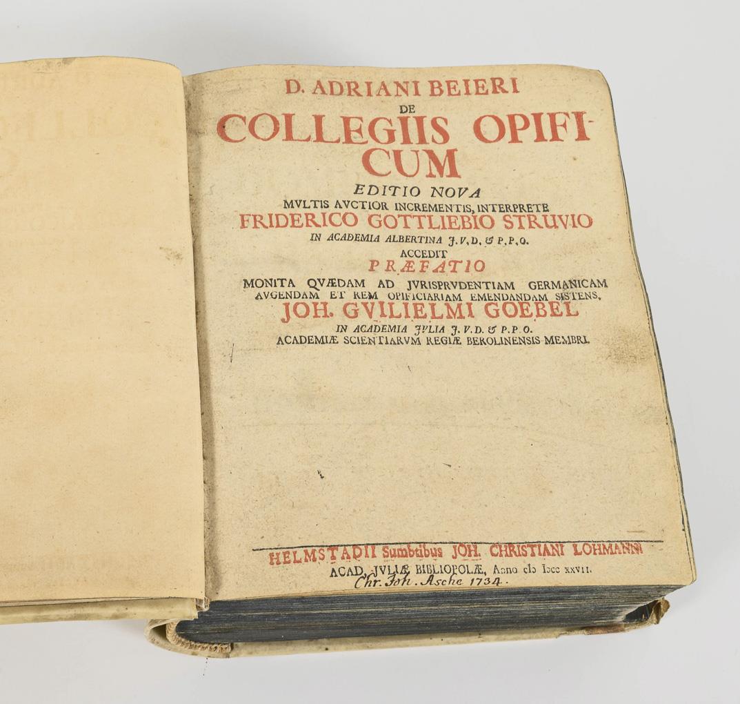 Beier, Adrian: "De Collegiis Opificum" Editio nova, F.G.Struvio, J.G. Goebel, Helmstedt 1727, 736 Seiten und Index. (Gründungsschrift des Handwerks- und Arbeitsrechtes) / Strube, David Georgii: "Commentatio de Jure Villicorum, vulgo von Meyer-Recht, Celle 1720, 180 Seiten und Index. / Scharnhorst, G.C.: "J.U.Licentiati & Syndici Civitatis Verdensis Conciliatio Decisionum Mevianarum ...", Hamburg 1699, 373 Seiten und Index. Pergamenteinband und Blauschnitt.