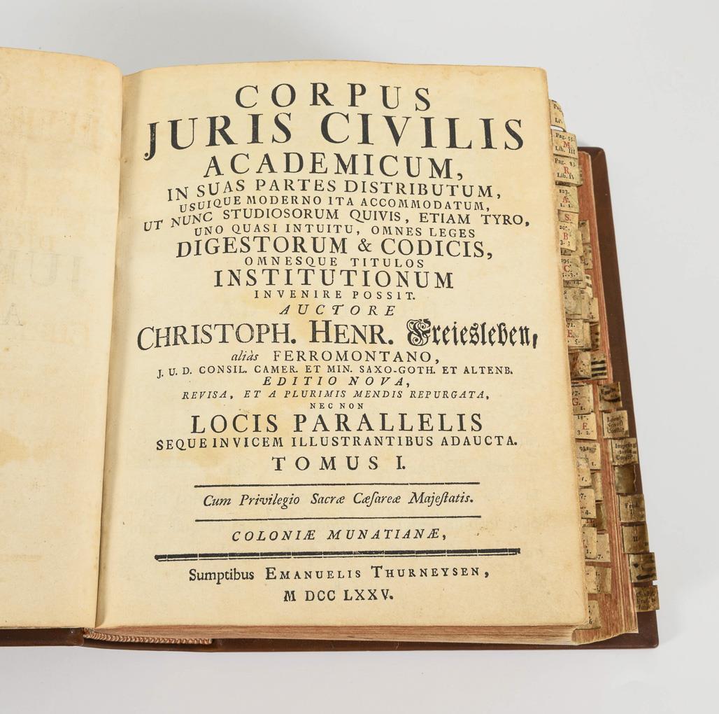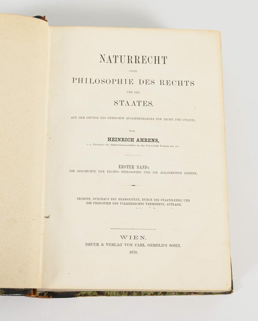 C.H. Freiesleben: "Corpus Juris Civilis Academicum, in suas partes distributum…," Köln 1775. 2 Teile in einem Band, 1794, 1416 Spalten. Mit alten handgefertigten Reitern, im Ledereinband mit Rotschnitt, 26 x 23 cm. / "Heinrich Ahrens: "Naturrecht oder Philosophie des Rechts und des Staates, auf dem Grund des ethischen Zusammenhanges von Recht und Cultur", Wien 1870 und 1871. 14, 390, 16, 530 Seiten im Halbledereinband, 22 x 16 cm. / G.I.F. Meisteri: "Principia Juris Criminalis Germaniae Communis", Göttingen 1828. 16, 578, (14) Seiten. Beigebunden "Kaiser Carls des fünften ... Peinliche Gerichtsordnung, nach der ältesten Ausgabe von 1533 abgedruckt", 136 Seiten. Halbledereinband mit Rotschnitt, 17,5 x 11 cm.