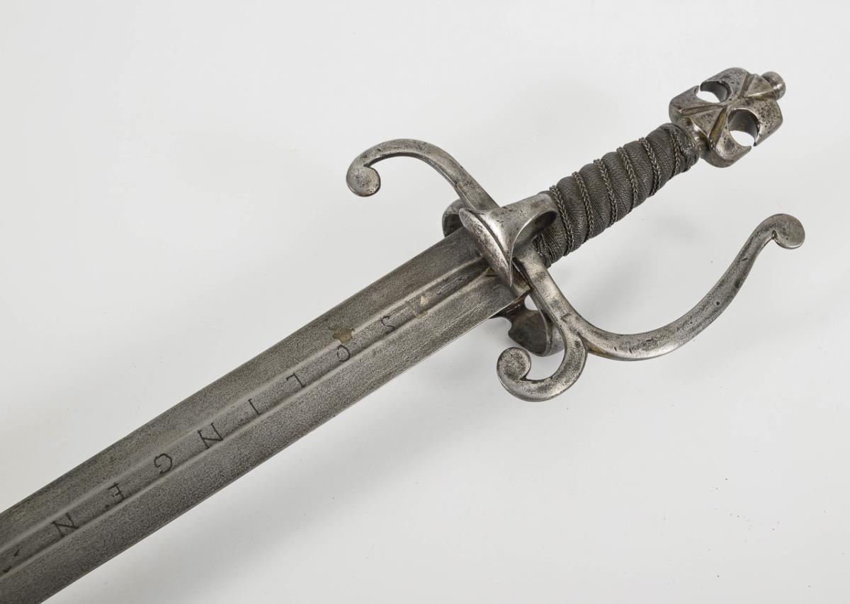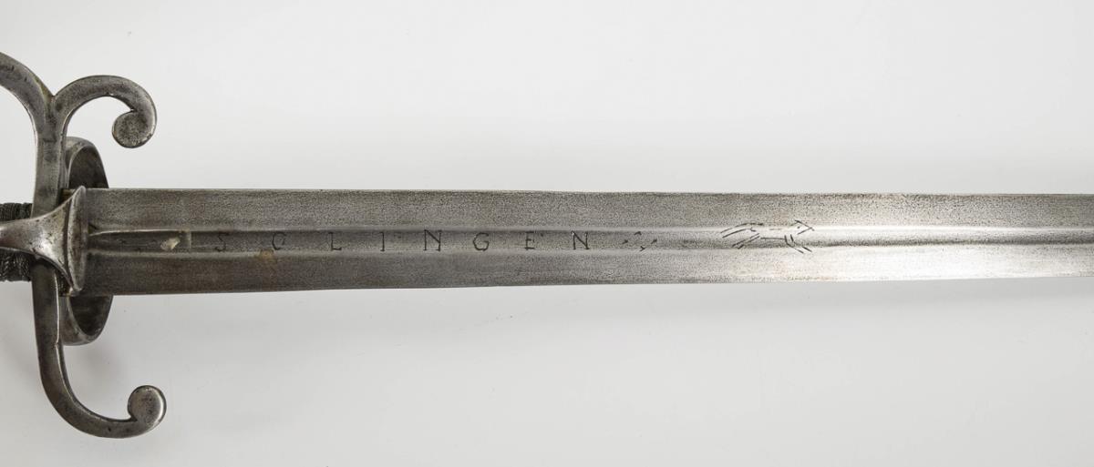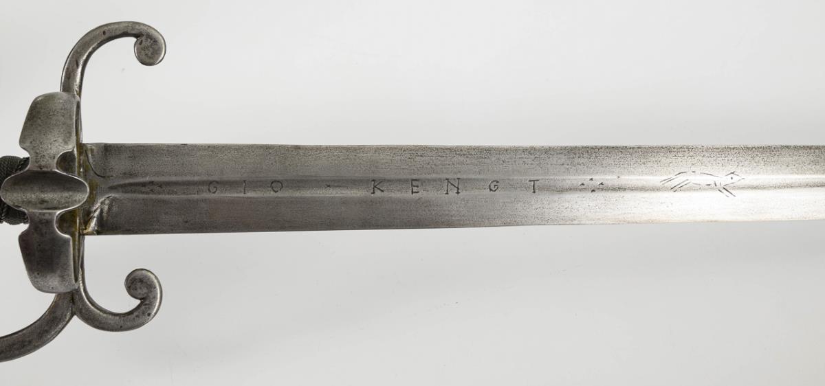 Gerade, zweischneidige, konische Klinge mit Mittelrinne. Dort "Gio Kengt" und "Solingen" sowie 'Solinger Wolf'. Gerippter Griff mit Drahtwicklung und 'Türkenbund', Stich- und Daumenring.