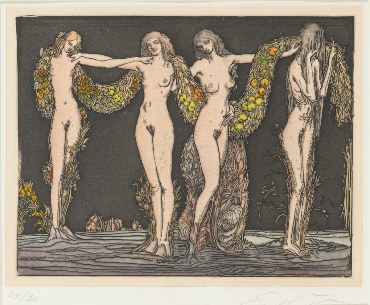 Allegorische Darstellung der vier Jahreszeiten als weibliche Akte in verschiedenen Lebensaltern, verbunden mit einer Girlande, die die jeweiligen Attribute der Saison trägt.
