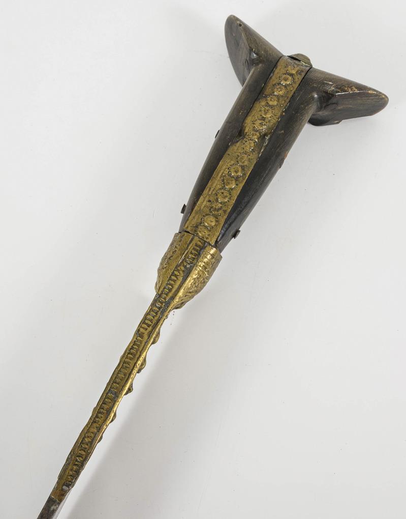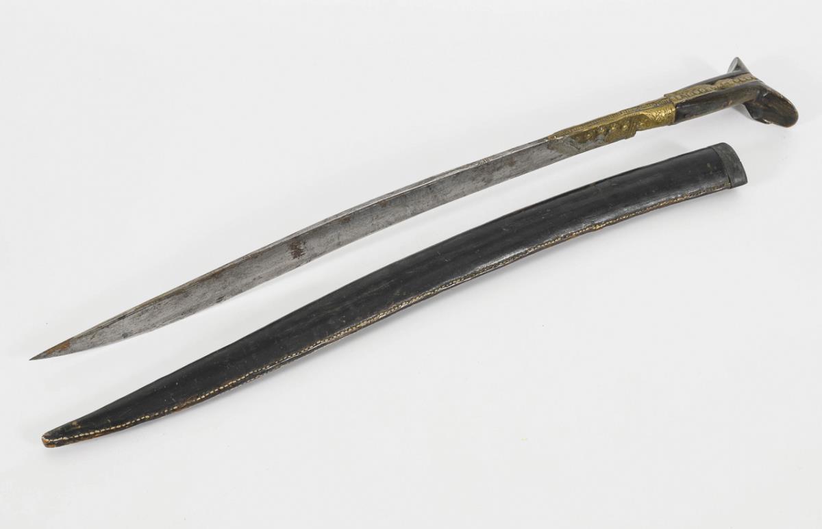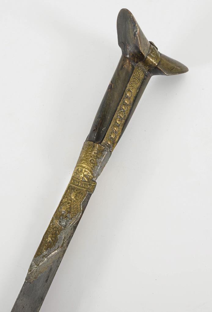Gekrümmte, einschneidige Klinge mit Spitze in der Rückenlinie. Messingmontierung über Klinge und Griff. Horngriff. Hölzerne Scheide mit Lederbezug. Altersspuren, Knauf mit kleinem Abbruch.