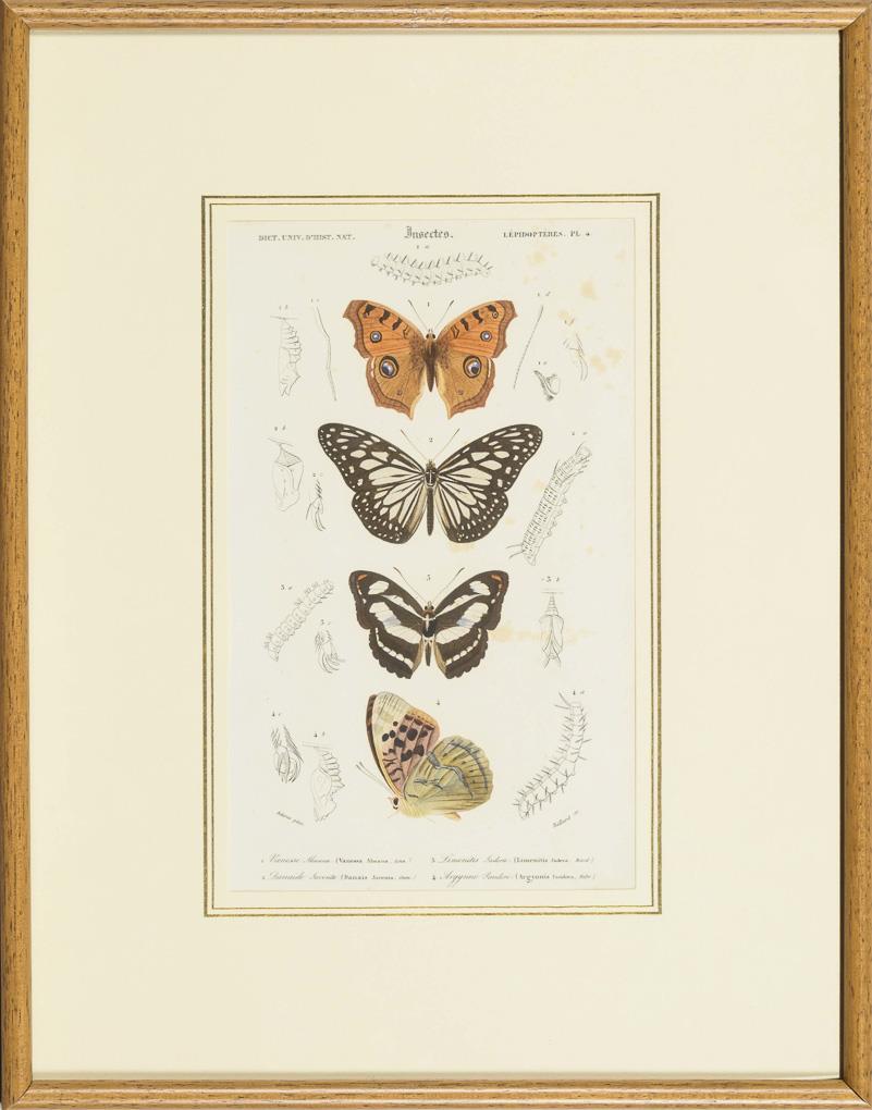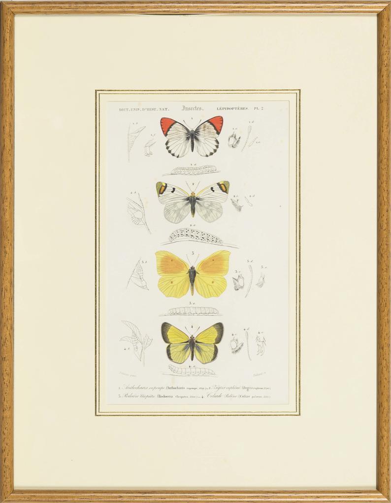 Unterschiedlichen Stadien des Lebenszyklus, von der Puppe, Raupe bis zum erwachsenen Insekt, teils auch als Umrisszeichnung oder Detailansicht. Teils leicht fleckig.