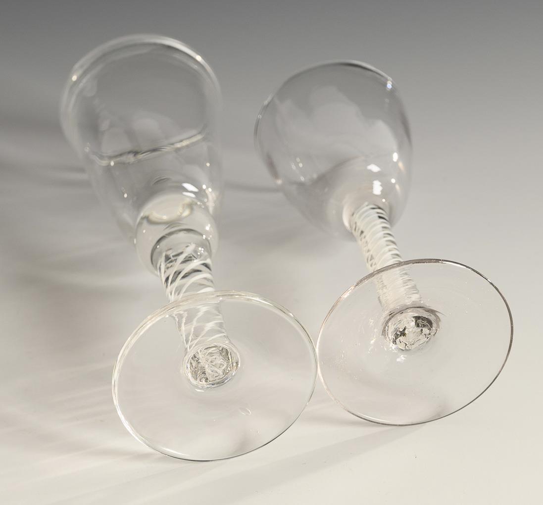1x konische Kuppa, Kugelnodus, Stängel mit weißem Spiralfaden, Rundfuß mit Abriss (H 15,5 cm). / 1x halbovoide Kuppa, Stängel mit weißem Spiralfaden, Rundfuß mit Abriss (H 12,5).