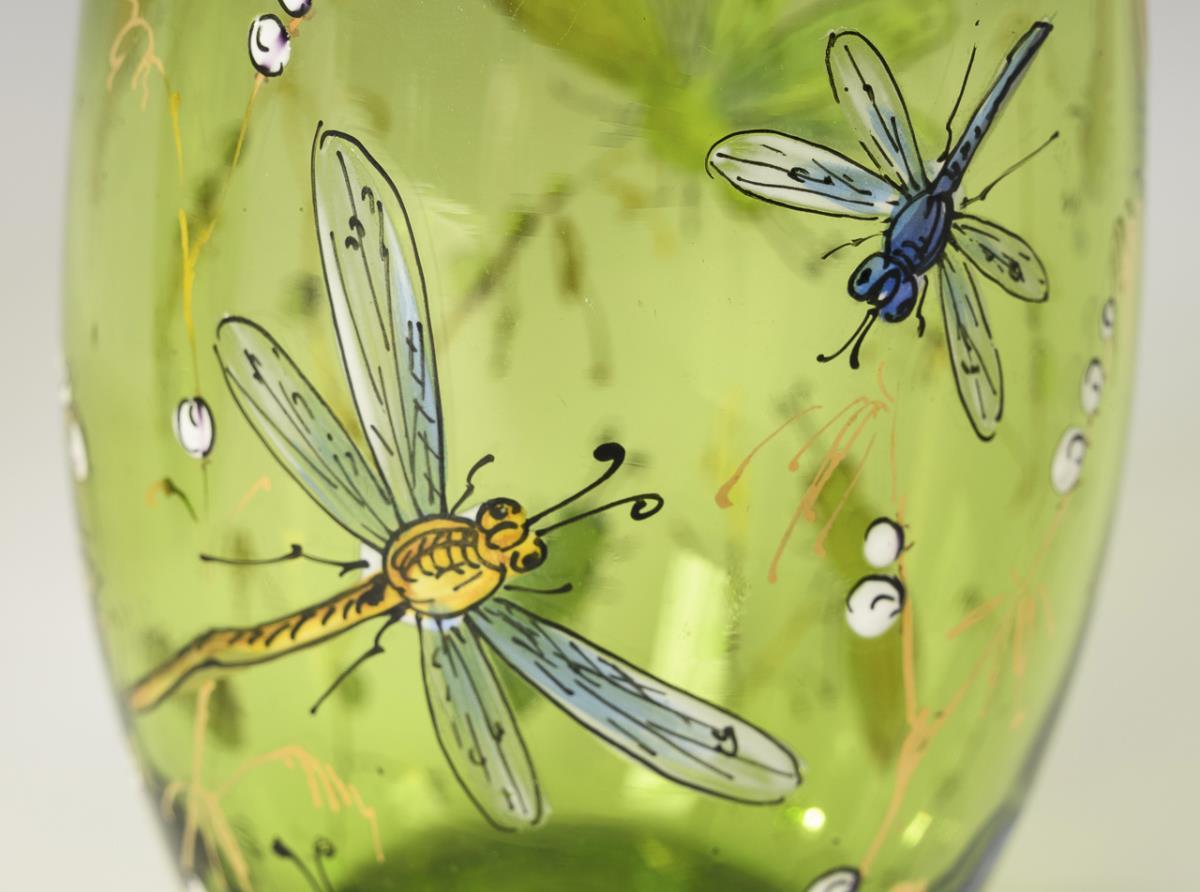 1x ELISABETH, um 1900: Balusterdose aus grünem Glas, mit violettem Fadennetz umsponnen, metallmontierter Rand mit Bügelhenkel und Knaufdeckel, irisiert (H 23 cm). / 2x Anfang 20. Jh.: konvexe Becher aus grünem Glas mit polychrom emailgemalten Insekten und Goldstaffage (H 9,5 cm).