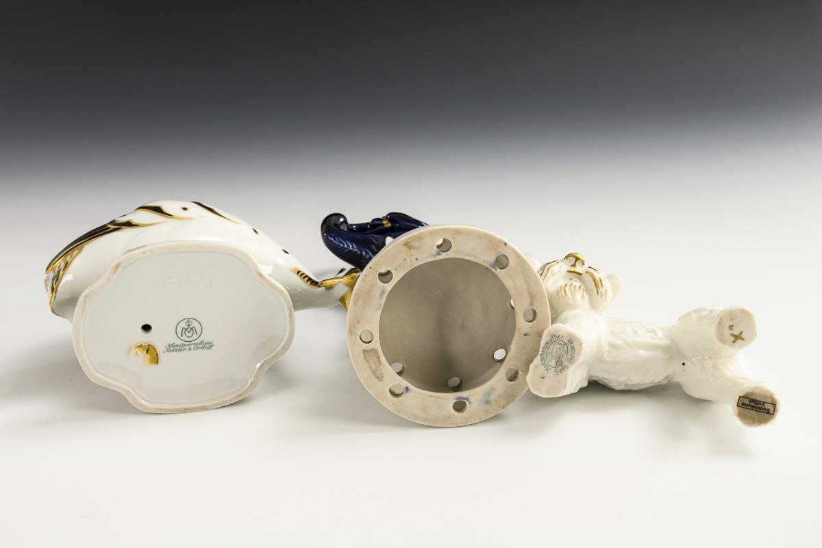 1x AELTESTE VOLKSTEDTER: Reiher als Steckschalenfigur (H 22,5 cm). / 1x METZLER & ORTLOFF, Modell-Nr. 3228: Perlhuhn (H 11,5 cm). / 1x HUTSCHENREUTHER: Zwergschnauzer (H 12,5 cm). Ausschleifung am Stand des Reihers.