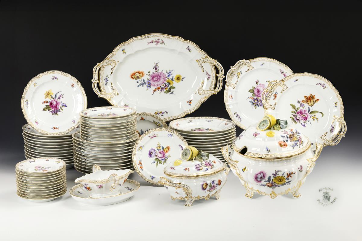 68 Teile. 27 Speiseteller, 11 Suppenteller, 12 Salatteller, 12 Dessertteller, 1 große Terrine (H 26 cm, Ø 33,5 cm), 1 ovale Terrine (L 26,5 cm), 1 Sauciere, 2 Gemüseteller (Ø 39,5 und 41 cm), ovale Platte (L 51 cm). Ausbruch am inneren Deckelrand der großen Terrine.