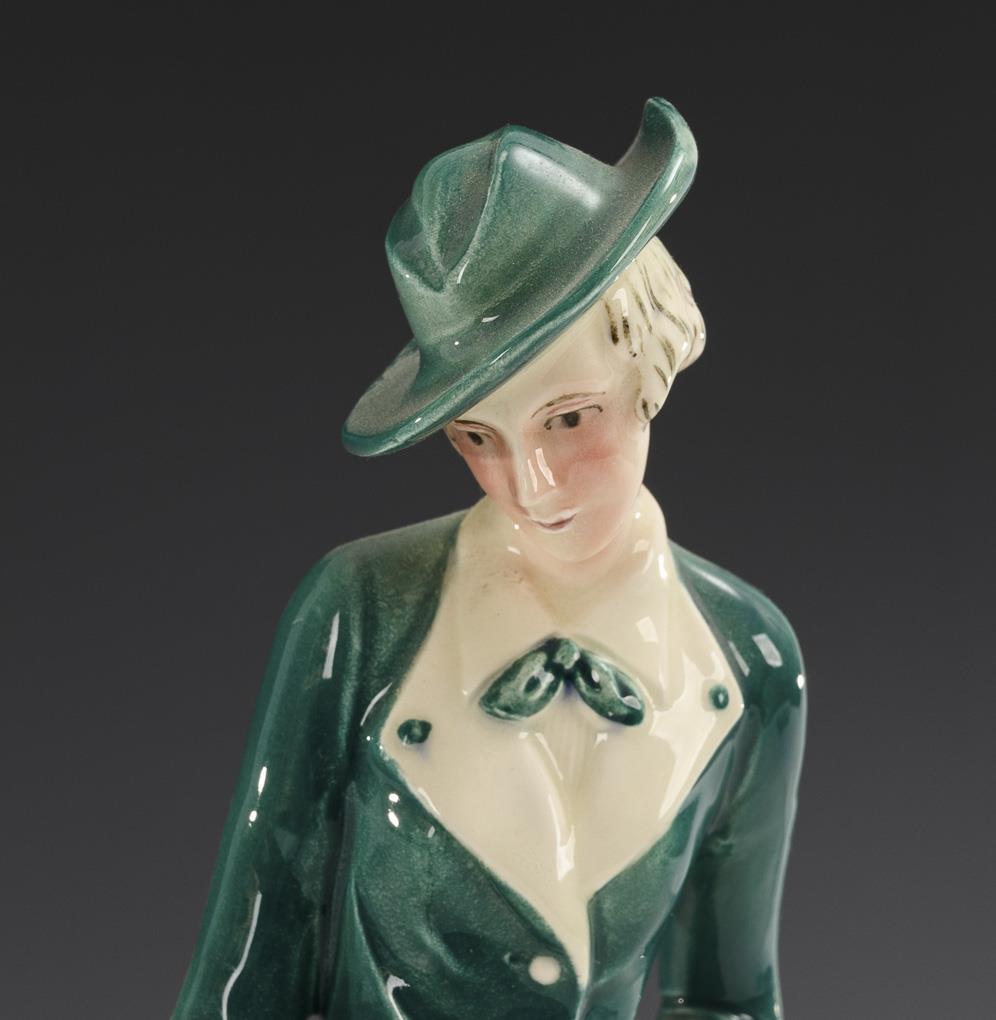 Elegant gekleidete Dame in grünem Kostüm, einen Barsoi an der Leine führend. Unterseitig am Sockel eine kleine Bestoßung.