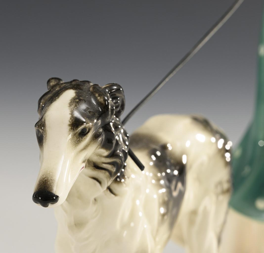 Elegant gekleidete Dame in grünem Kostüm, einen Barsoi an der Leine führend. Unterseitig am Sockel eine kleine Bestoßung.