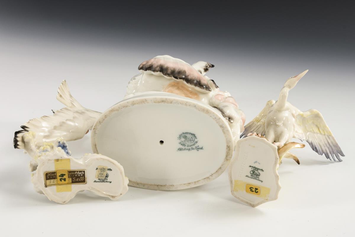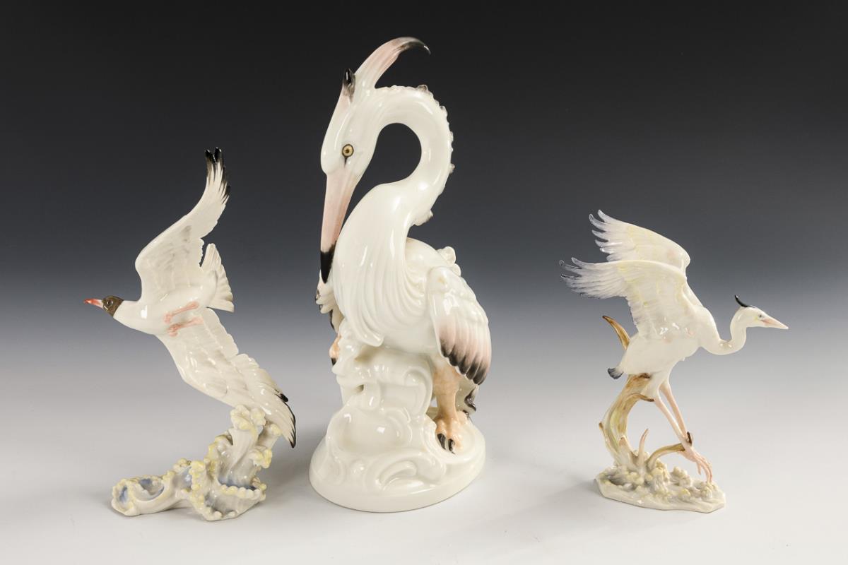 1x exotischer Wasservogel, Art-déco-Entwurf von Karl Tutter (1883-1969) (H 23 cm). / 1x über Wellen fliegende Möwe (H 19,5 cm). / 1x im Wasser landender Reiher (H 14 cm) .