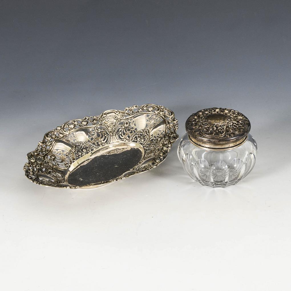 Durchbrochen gearbeitete Schale mit Rosen- und Rocaillenreliefs (25 x 18 cm, 227 g). / Runde Glasdose mit reliefiertem Sterlingsilberdeckel (H 9 cm, Ø 10,5 cm, 42 g).