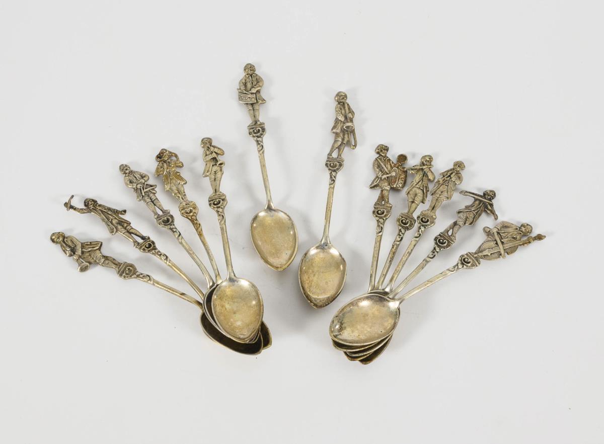 12 Kaffeelöffel mit figürlichen Griffen. J.D. Schleissner & Söhne, Hanau.