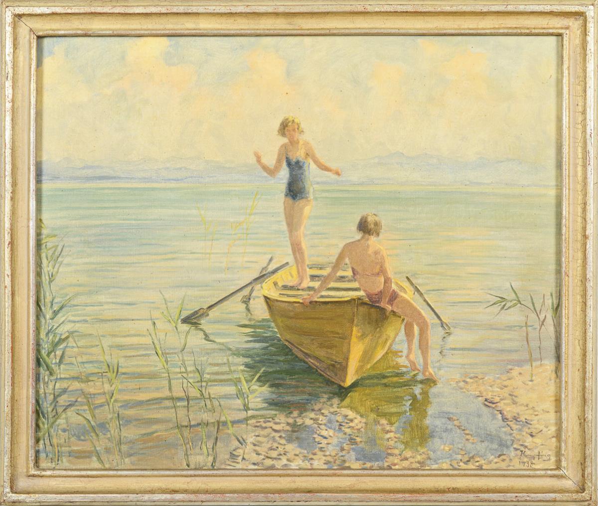 Zwei Mädchen beim Ruderboot am Seeufer im Sonnenschein.