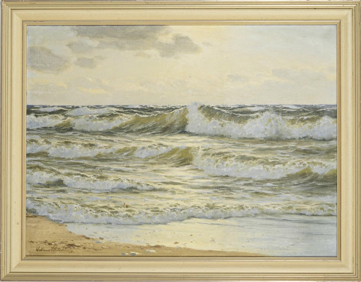 Blick vom Strand über die Brandung hinaus aufs Meer unter sonnigem Himmel. Minimale Altersspuren.