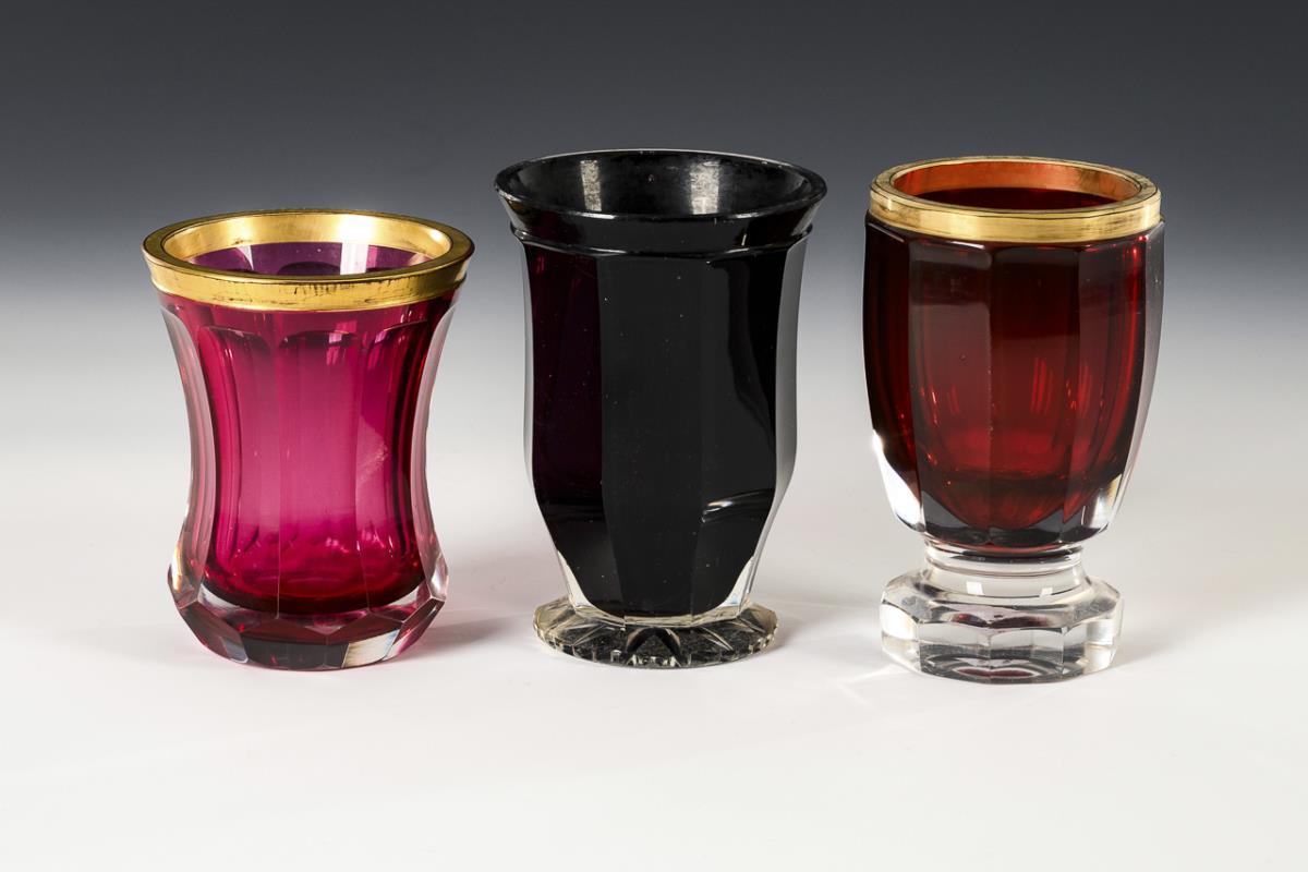 Verschiedene facettierte Becher aus farblosem Glas, 1x mit opak-rubinrotem Innenfang, 1x mit rubinrotem Innenfang und 1x mit rosalinfarbenem Innenfang. 2x mit Goldrand. 1x Mündungsrand minimal bestoßen.