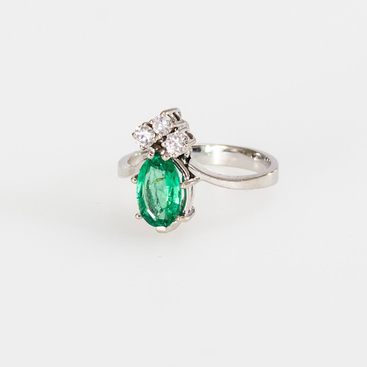 Feiner, chatongefasster Smaragd und 3 Brillanten. Schmale Schiene.
