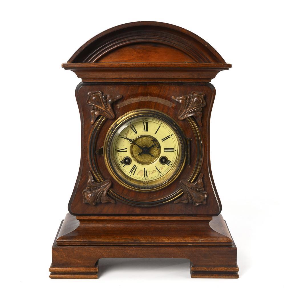 Architektonisches Gehäuse mit Rundbogengiebel, geschweifter Front mit aufgelegten floralen Schnitzereien und profiliertem Sockel. Alters- und Gebrauchsspuren, ein Stück des Rundprofilstabes fehlt, 1 Zeigerspitze abgebrochen (liegt anbei), teils berieben.