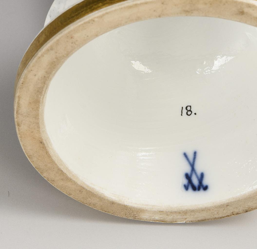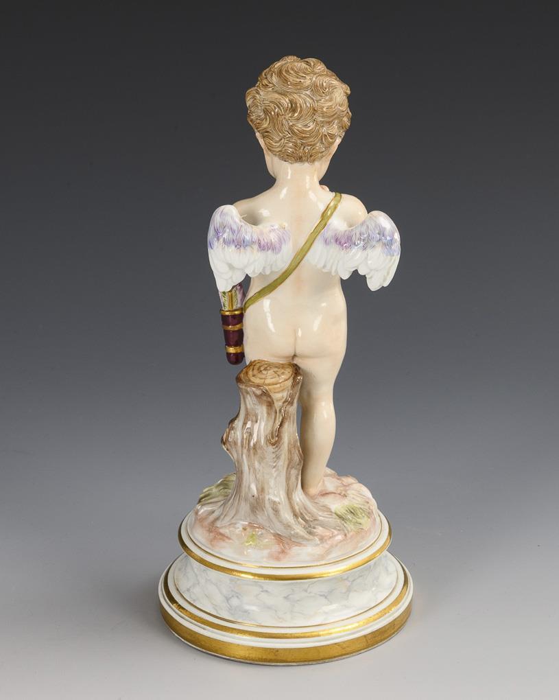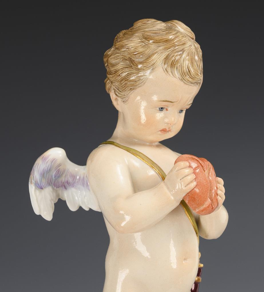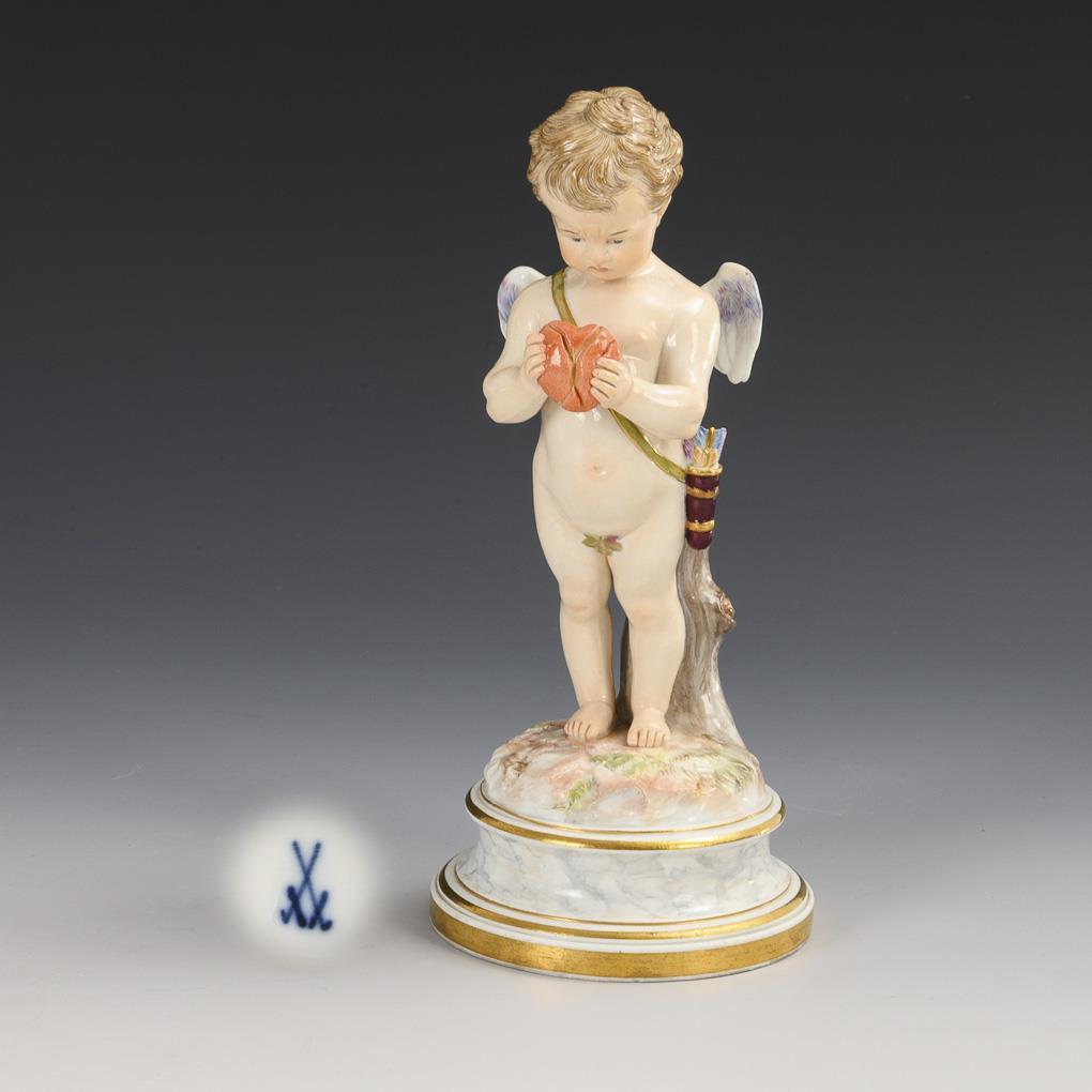 Auf einem Rundsockel stehender Amorknabe, betreten auf eine gebrochenes Herz in seinen Händen schauend.
