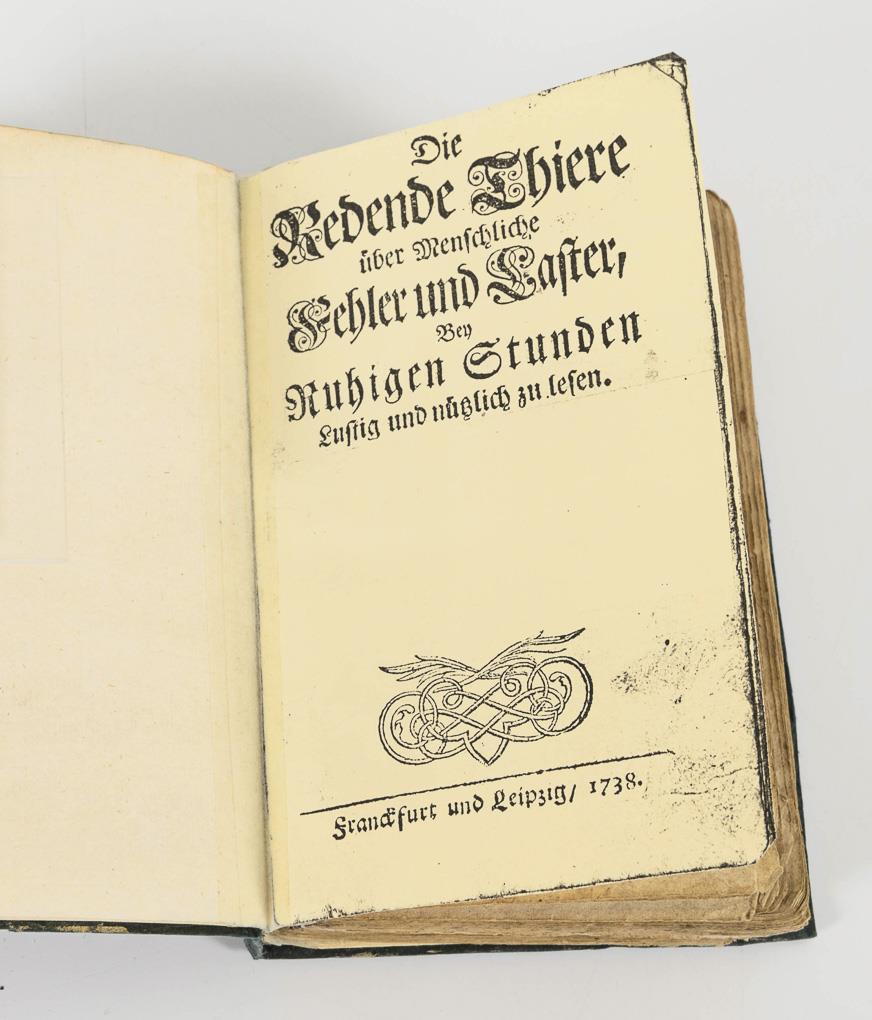 3 Teile in einem Band. Gespräch zwischen Pferd und Fliege, 106 Seiten. "Zweytes Gespräch zwischen einer Mauß und einen Papagay", 122 Seiten. "Drittes Gespräch zwischen einem Bären und einer Grille", 80 Seiten, danach fehlen Seiten. Jünger nachgebunden in einem Einband mit Holzstruktur, Titelblatt kopiert. 2 Abbildungen.