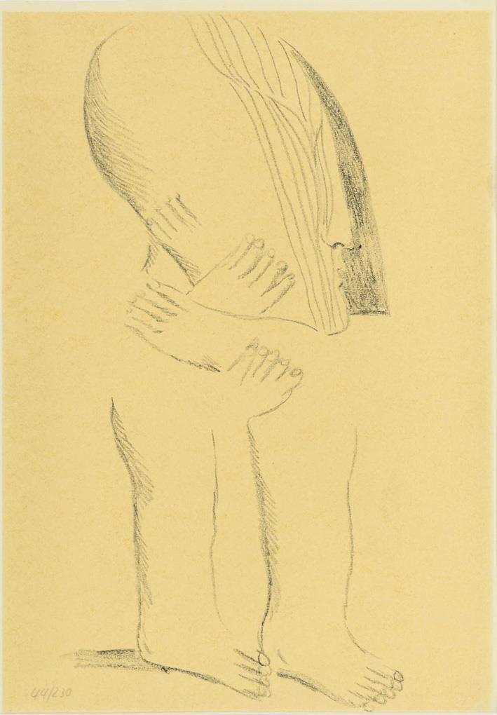 Abbildung eines amorphen Wesens aus Kopf und Beinen. Rechts minimal fleckig.