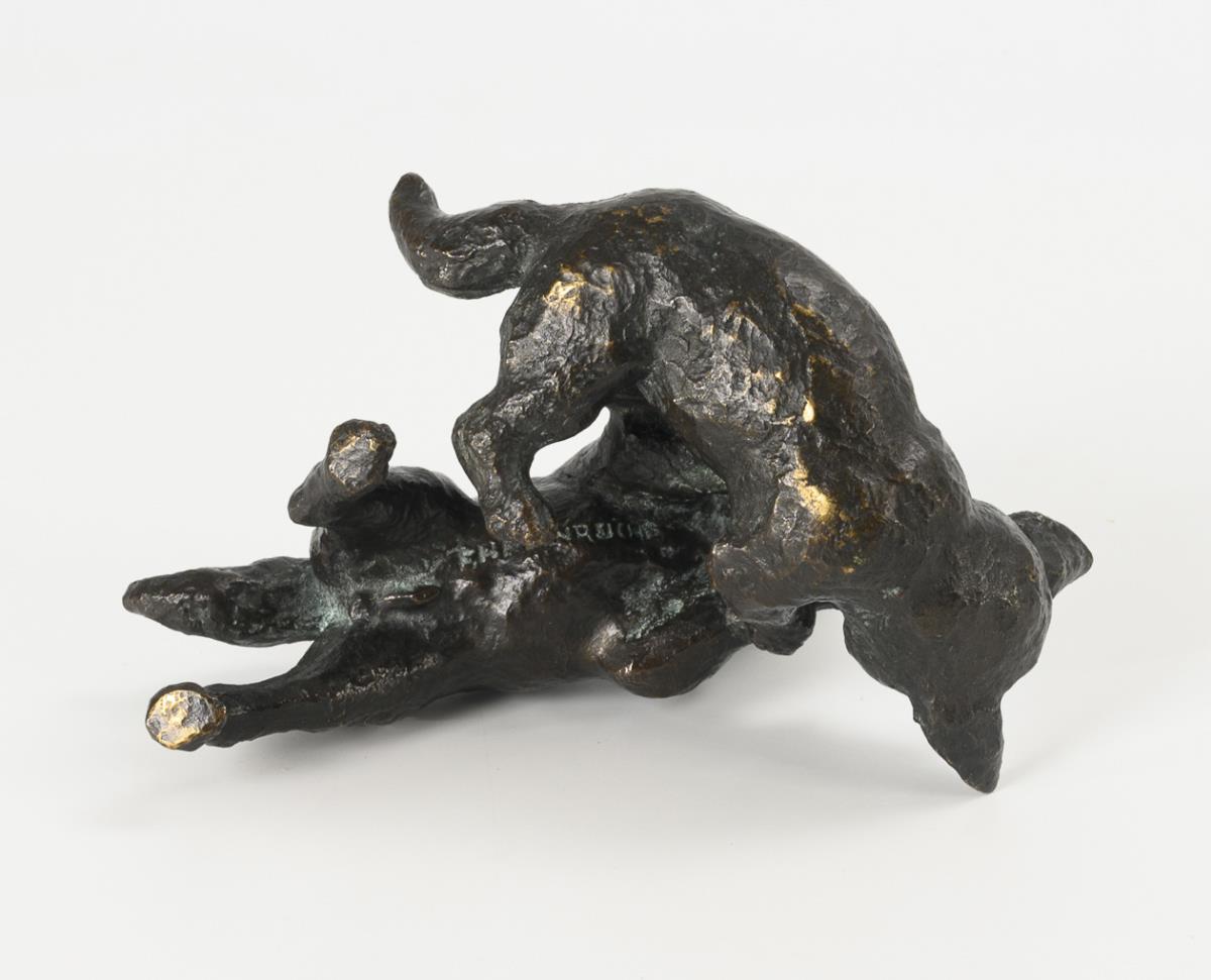 Sich balgende junge Füchse. Patina minimal berieben.