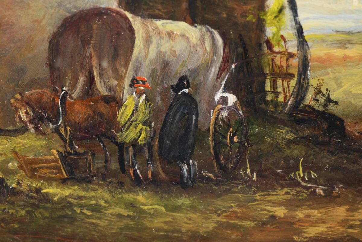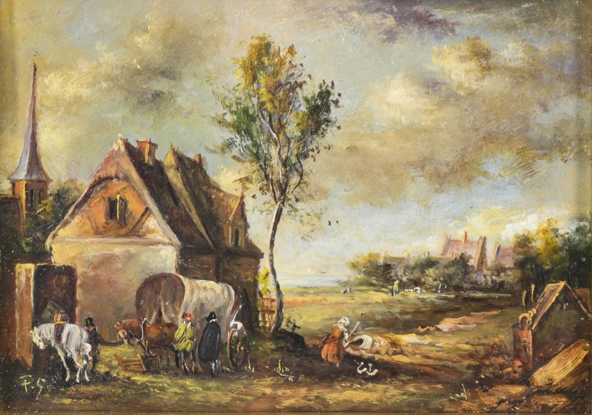 In der Tradition der holländischen Malerei des 17. und 18. Jahrhunderts ausgeführte Dorflandschaft mit Planwagen und Bauernvolk unter bewölktem Himmel.