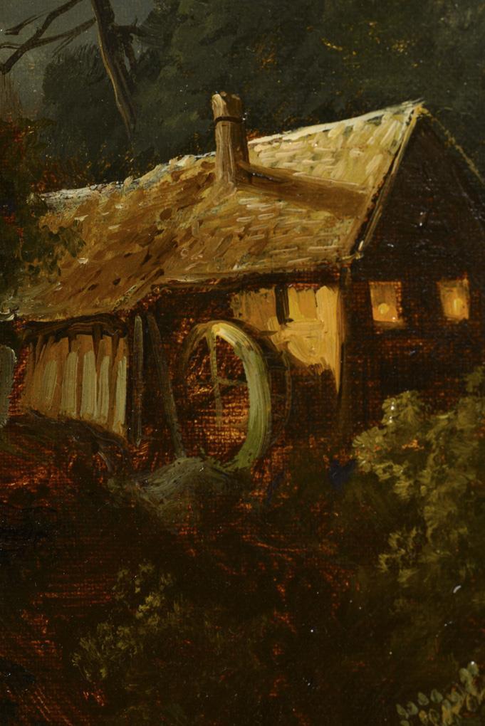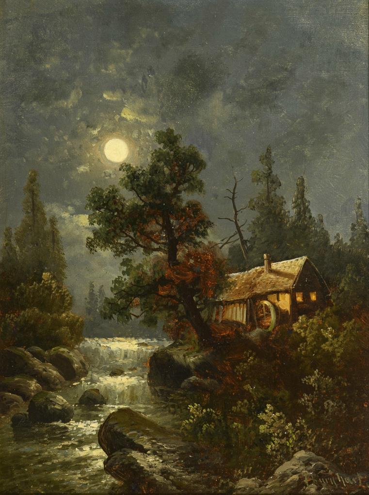 Wassermühle unter dem Vollmond im Gebirge sowie Bauerngehöft nahe einem Teich bei untergehender Sonne. Je leichte Altersspuren.