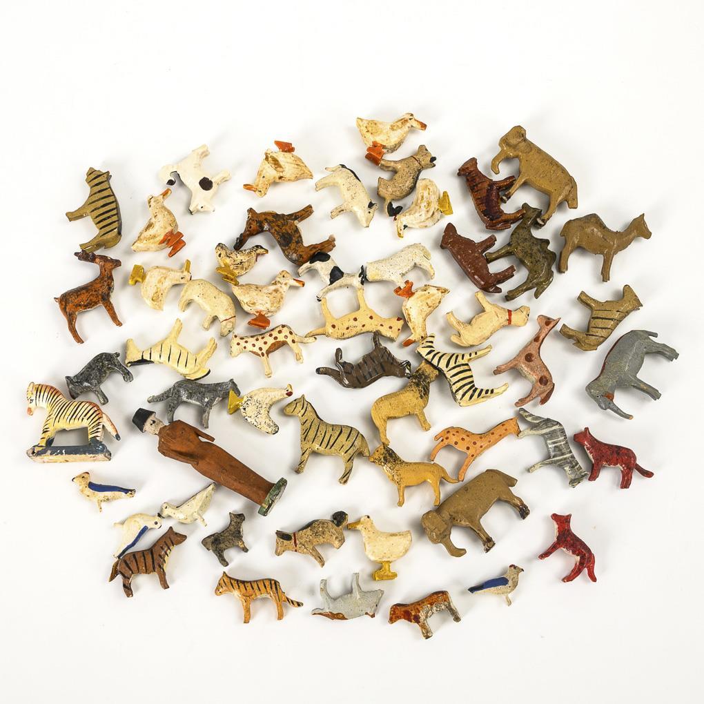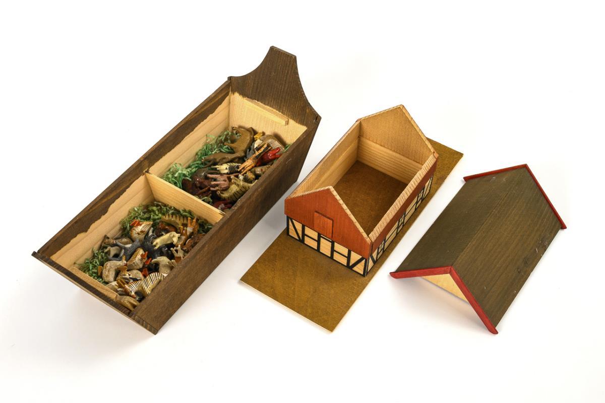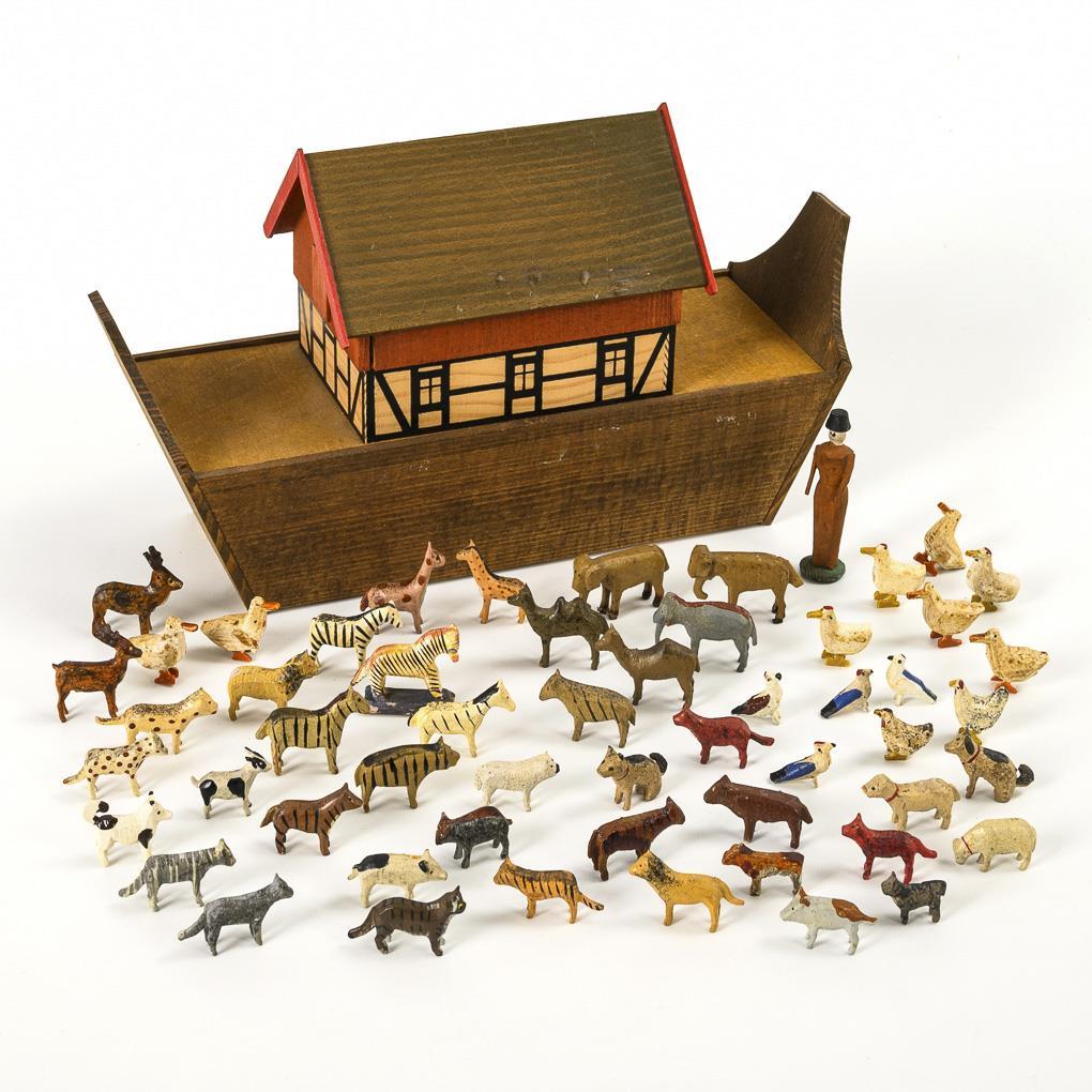 Neuzeitliche Arche aus dem Erzgebirge, 15 x 24,5 x 9 cm. Darin alte kleine Reifentiere aus den 1930er Jahren, H 1,5 - 2 cm. Tiere teils mit minimalen Altersspuren.
