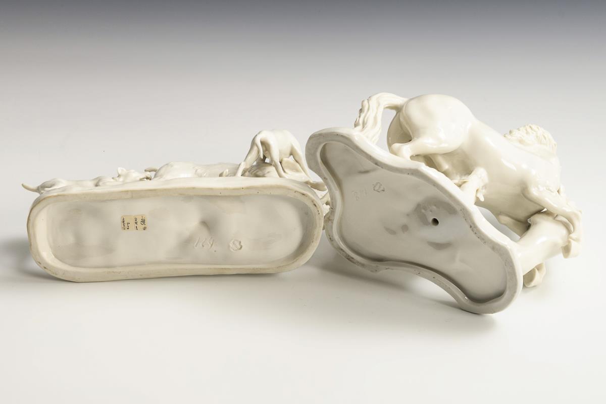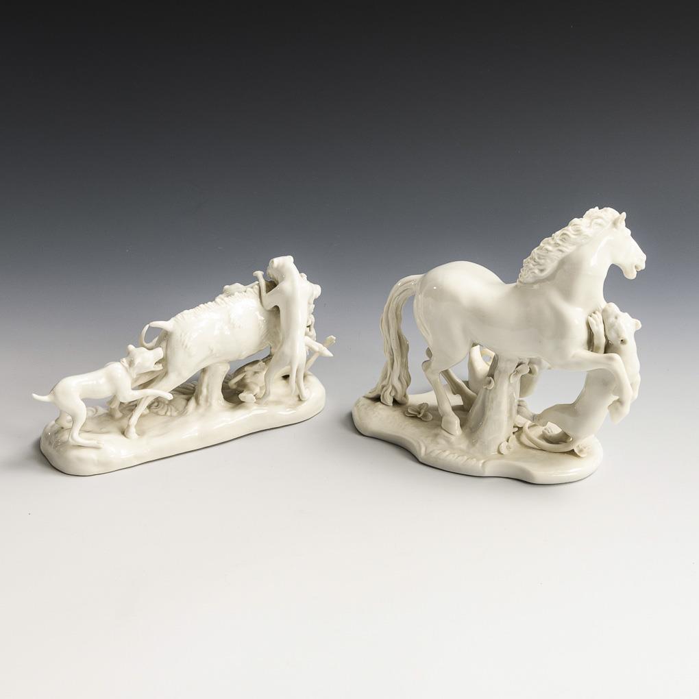 1x Modell-Nr. 124: vier einen Eber hetzende Jagdhunde (H 10,5 cm). / 1x Modell-Nr. 418: Pferd, von zwei Panthern angefallen (H 16,5 cm). 2 Pantherbeine restauriert.