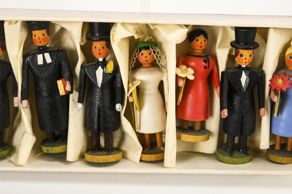 Holz, farbig bemalt. H der Figuren 3 - 4,5 cm, Maße der Schachtel 2 x 20 x 5,5 cm.