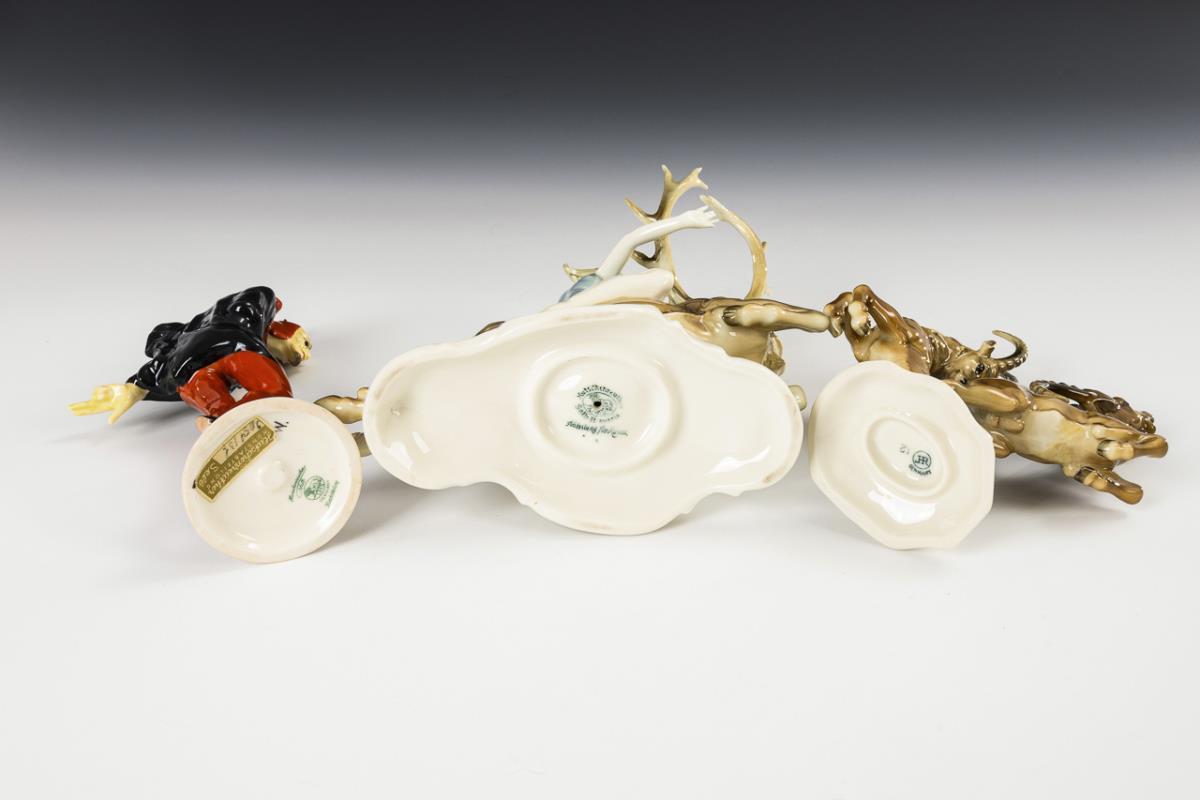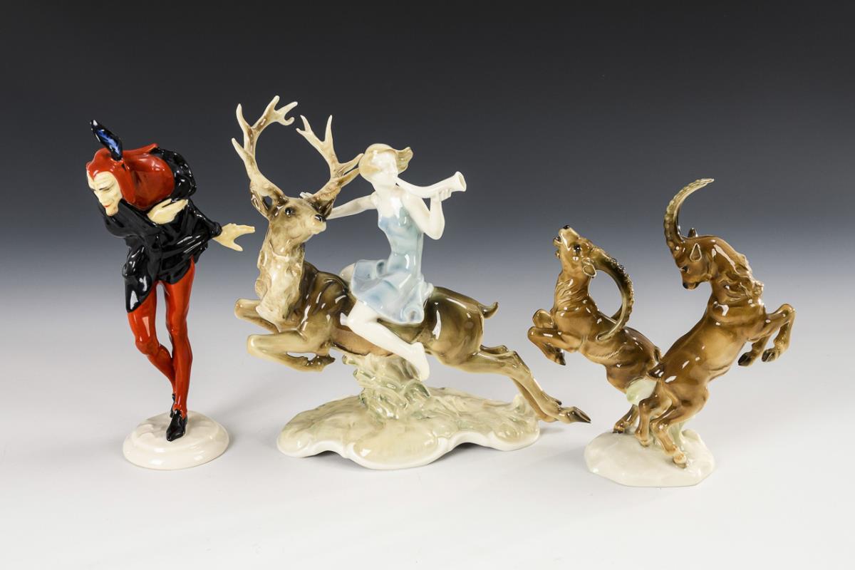 1x Mephisto, Entwurf von Karl Tutter (1883-1969) (H 18,5 cm). / 1x die hornblasende Diana auf einem springenden Hirsch, Entwurf von Carl Werner (1895-1980) (H 18,5 cm). / 1x Paar Steinböcke, Entwurf von Karl Tutter (H 15,5 cm). Minimale Bestoßung an der Hutfeder des Mephisto.