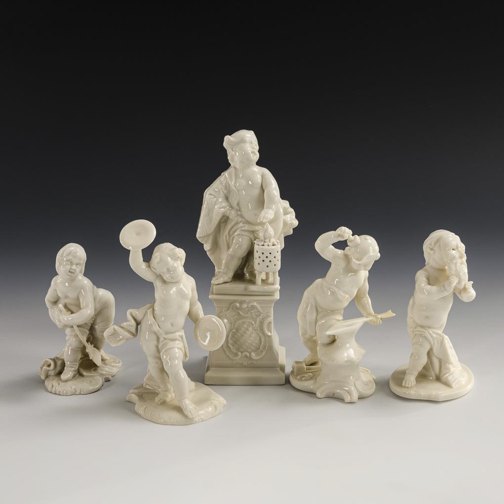 1x 669: Putto als Winter auf einem Postament (H 17 cm). / 1x Modell-Nr. 629: Putto mit Maske (H 11 cm). / 1x Modell-Nr. 254: Putto als Schmied (H 11,5 cm). / 1x Modell-Nr. 348: Putto mit Becken (H 12,5 cm). / 1x Modell-Nr. 245: Putto mit Fisch und Paddel (H 10 cm). Linke Hand und Pfeilende des "Schmieds" restauriert.
