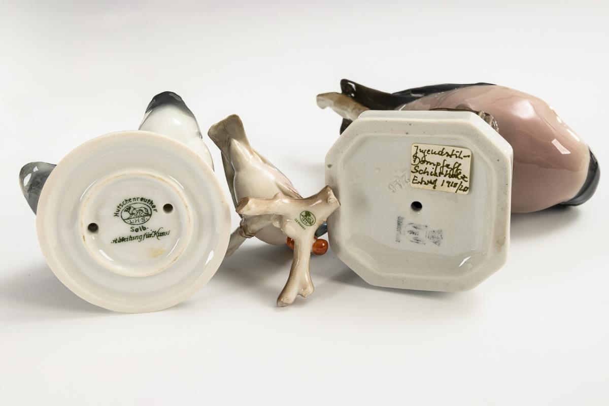3x HUTSCHENREUTHER: Schwan (H 23 cm), Entenpaar (H 7 cm) und Gimpel (H 5,5 cm). / 1x SCHIERHOLZ: Gimpel (H 11,5 cm). / 1x undeutlich gemarkt: Käuzchen (H 15 cm).