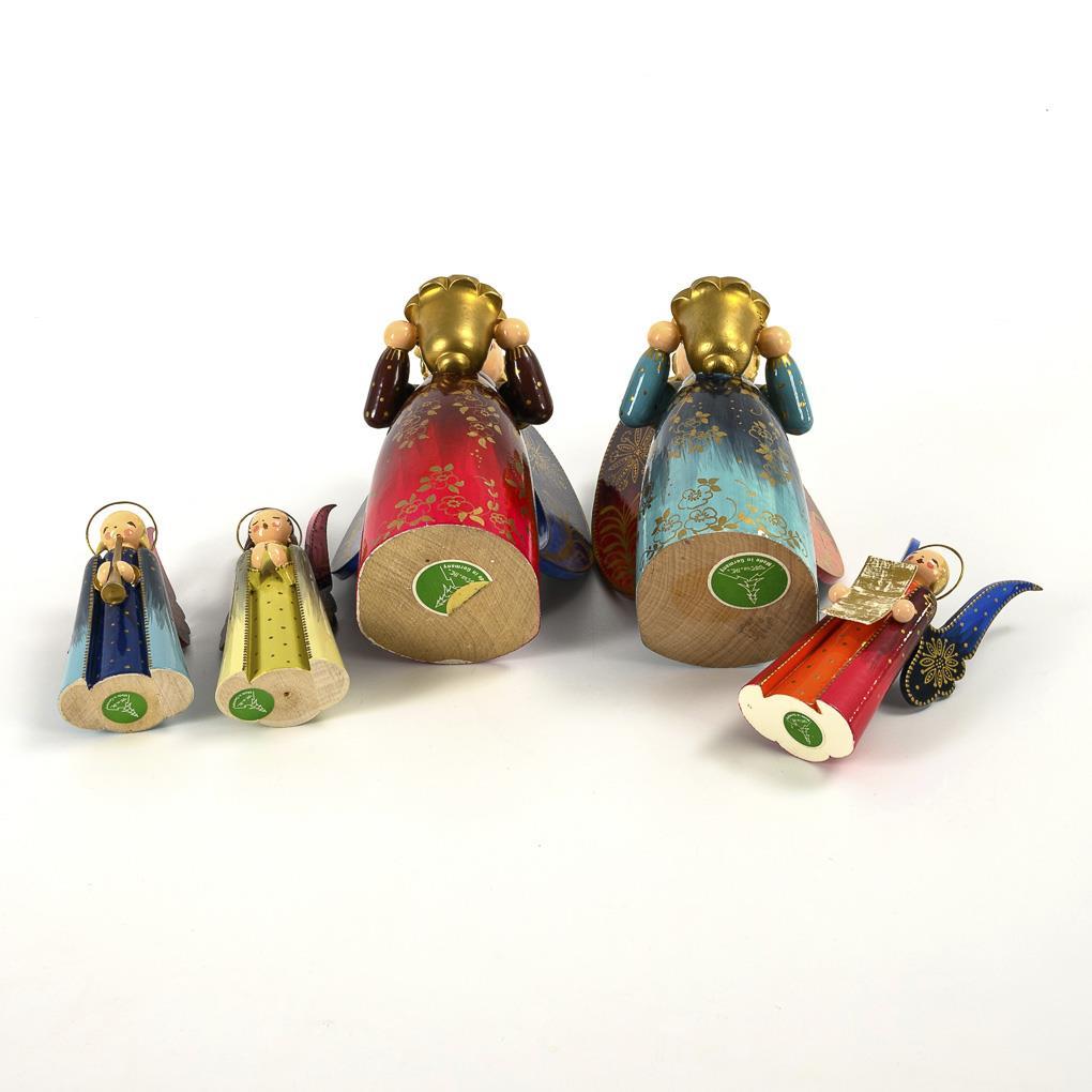 Reich bemalte Engel in Rot, Blau und Grün. Die beiden großen Engel mit Lichtnapf (H 17 cm), die 3 kleineren musizierend (H 12,5 cm). Lichtnäpfe mit Gebrauchsspuren.