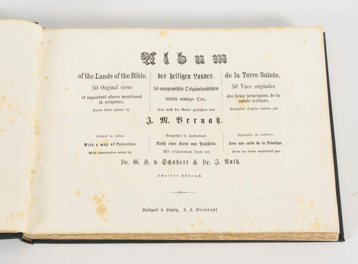 50 ausgewählte Originalansichten biblisch wichtiger Orte treu nach der Natur gezeichnet von J.M. Bernatz. Mit Texten von G.H. v: Schubert und J. Roth. 2. Abdruck. Im goldgeprägten Leineneinband. Block stockfleckig.